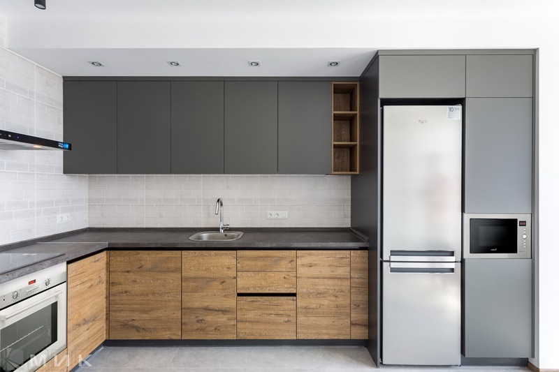 Цвет корпуса, фасада, столешницы, стекла, ручки могут быть практически любыми, цена при этом не поменяется. Кухня может быть оснащена доводчиками (Blum, Boyard).